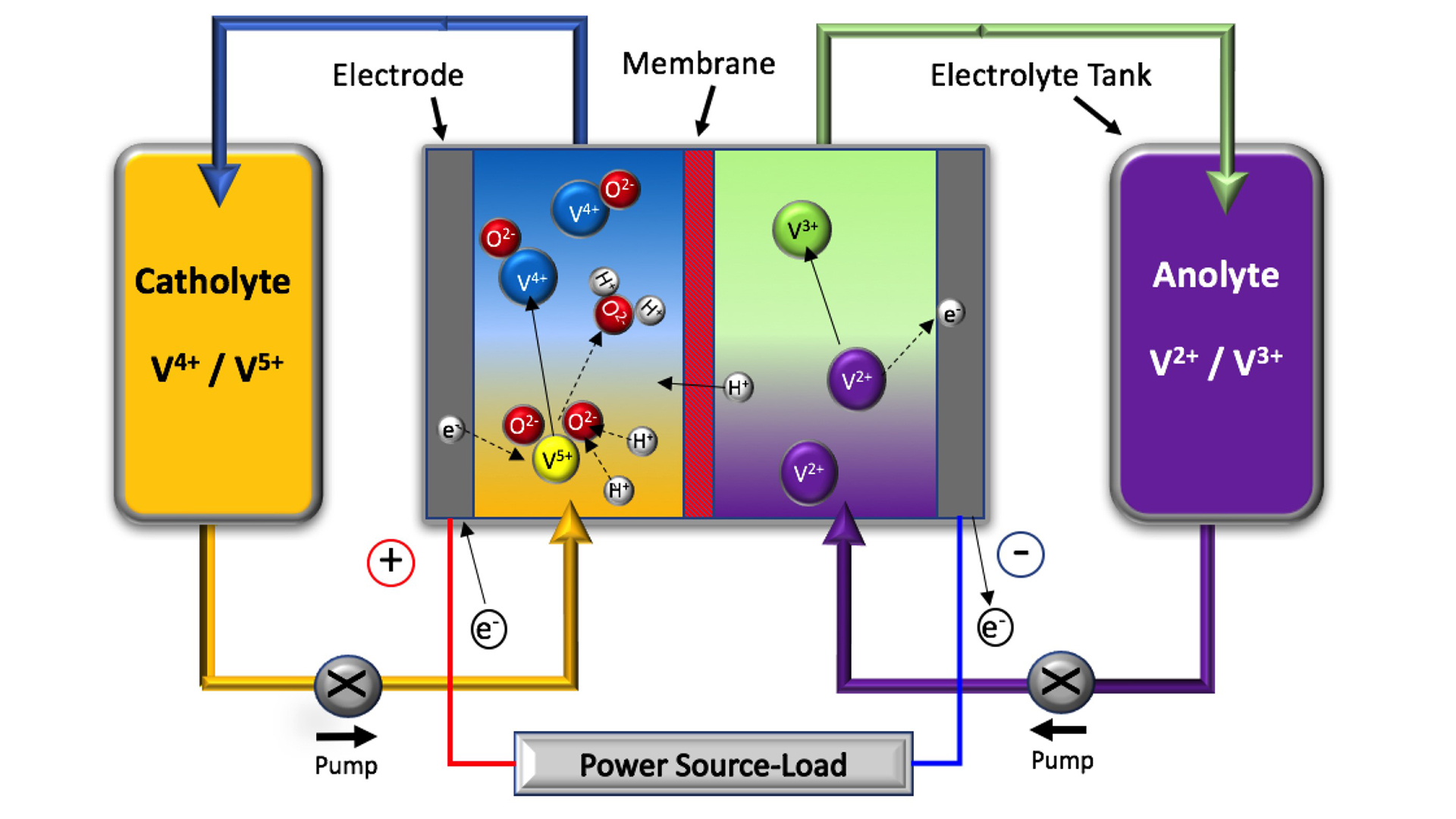 There are two electrolytes, one that is positively charged and one that is more negatively charged. The technology exploits the natural ability of vanadium to exist in four different oxidation states. Each electrolyte tank is charged with vanadium in a different redox couple. The two electrolytes do not mix together but are separated in the cell stack by an extremely thin membrane that only allows selected ions to flow through.