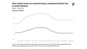 Prices for rare earths have fallen in recent months in line with continued weak demand from the downstream magnet sector. Fastmarkets’ weekly price assessment for the neodymium-praseodymium oxide 99% ratio (75:25), fob China price fell to $50-52 per kg on 11 July, from $54-56 per kg in late April.