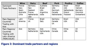 The MATS review also identified trends in agri-food trade for six agri-food products traded globally (wine, dairy, beef, pork, poultry and coffee). Their impact was identified in terms of trade flows and socioeconomic factors with respect to various trade policies (e.g., tariffs and non-tariff measures) and trade regimes (e.g., trade agreements between EU-Africa and EU-UK). This analysis (https://zenodo.org/records/6411136#.YkrhfihBxPY) included findings for key EU trade partners and regions (Figure 3).