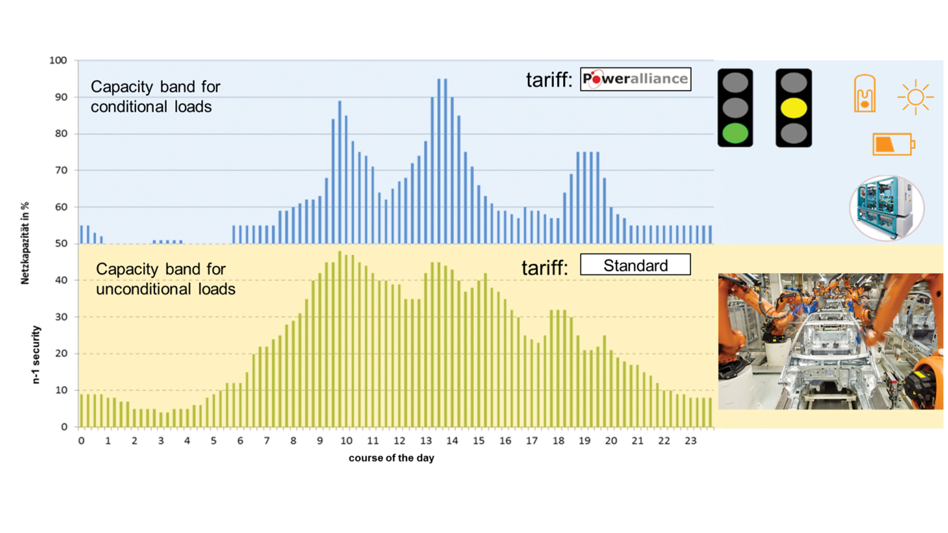 Figure 1 shows that the 100% physical grid capacity at a given bottleneck in the mid voltage grid can be split into a capacity band reserved for unconditional loads (a production line in the auto industry and a residual physical band, for instance) which can be used for conditional loads (such as price-driven power-to-heat and power-to-gas application, and batteries etc. for industrial use).