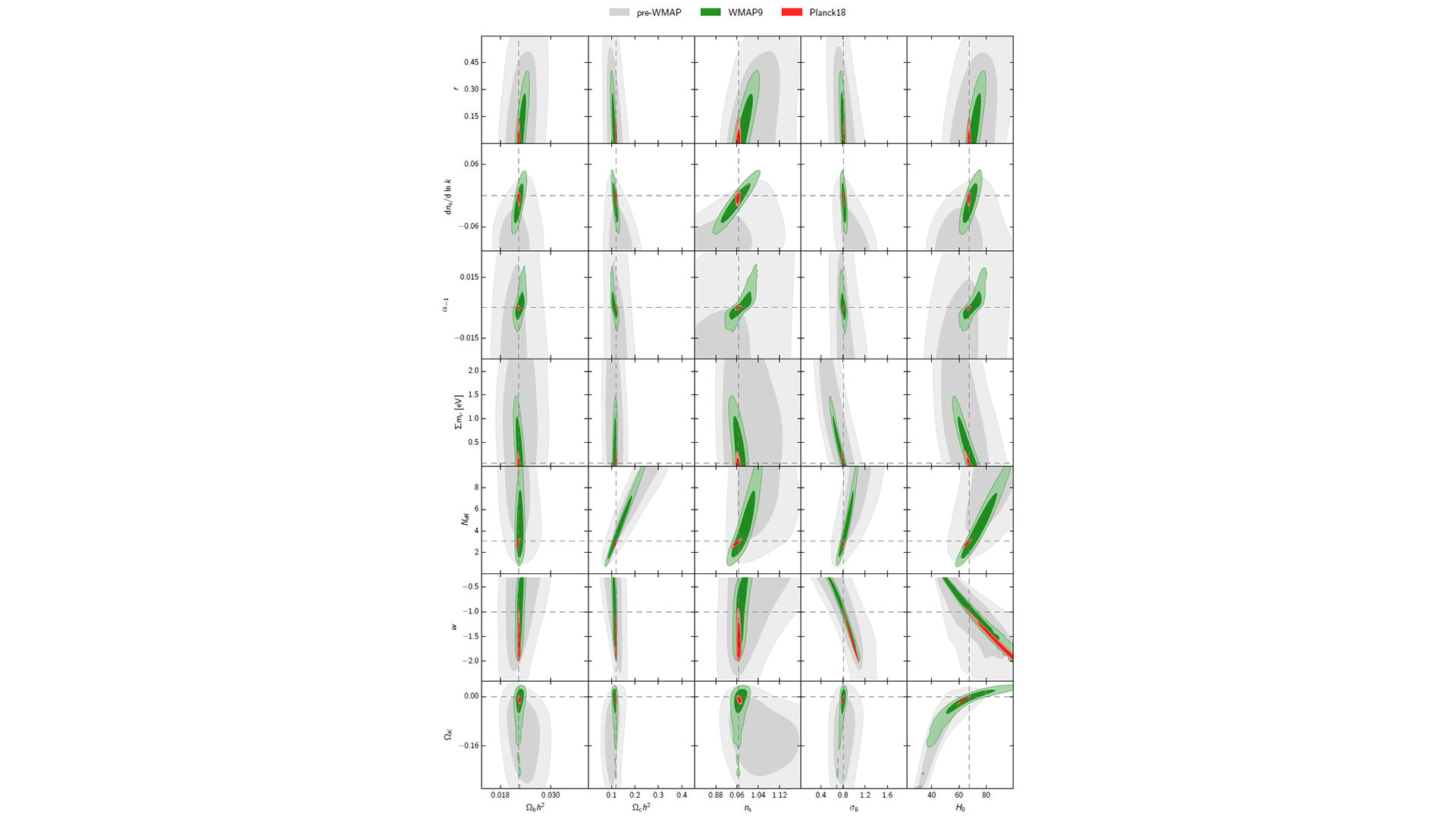 The results are graphically given in Fig. 4, which shows the acceptable range of seven of these new parameters, in conjunction with the modified constraints of the base LCDM parameters. One can then assess such effects at three levels of precision, considering the data pre-WMAP, post-WMAP, and post-Planck. At the level of Planck’s precision, the base parameters are mostly unaffected by these new degrees of freedom, which demonstrates the resilience of key results to the introduction of these extensions.