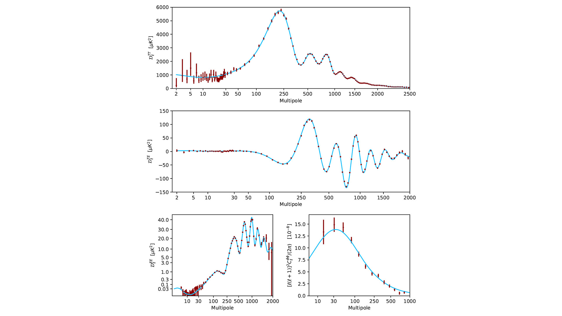Of course, these CMB maps do not directly tell us the history of the Universe. We need to characterise them mathematically and confront the result with a priori theoretical models. One image may prove useful. We can think of a CMB anisotropy map as a map of the surface of a planet covered with oceans, with the colours coding the relative height of the surface in different locations. A most revealing transformation would be to decompose the height variation in a superposition of waves of different height and wavelengths. From that we could then assess the distribution of the heights of waves of a given wavelength, and in particular extract the typical height of a wave as a function of its wavelength, or rather of its inverse, its multipole. This is what we actually do for temperature anisotropies, and the top panel of Fig. 3 shows the result, known as the power spectrum of the anisotropies. A similar process can be performed for polarisation1, the cross-correlation of intensity and polarisation, or the lensing effect, which are shown in the other panels of Fig. 3. In all cases, this amounts to a characterisation of the typical strength of a signal versus scale.