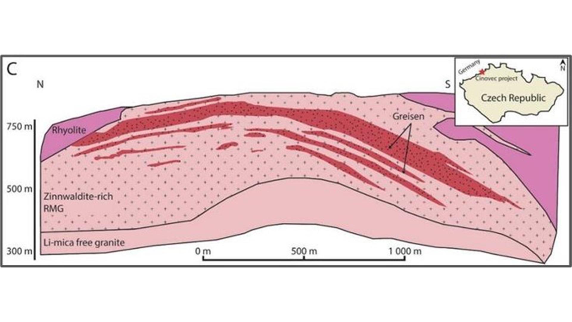 The RC drilling targets the potential for either lithium mica and spodumene-bearing pegmatites or a new style of large tonnage hard rock lithium deposit hosted near the top of a large granite body rich in lithium micas (lepidolite). A similar example is demonstrated at the Cinovec deposit in the Czech Republic (Figure 4).