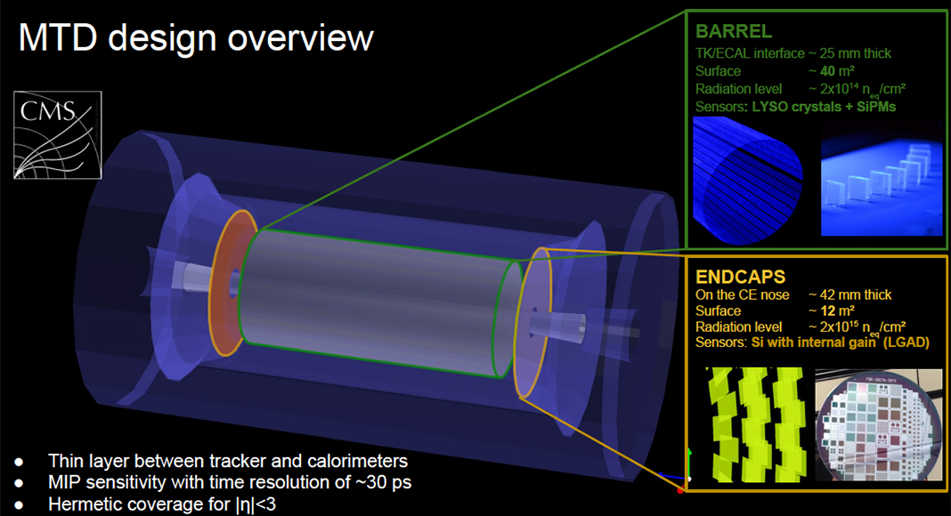 This new timing detector is composed of 350,000 to 500,000 LYSO crystal sensors of sizes of order 57mm x 2-3.5mm2 which produce blue light of wavelength approximately 350 nm when a minimum ionising track produced by the proton-proton interaction passes through the crystal. That light is detected by silicon photodetectors (SiPMs) positioned at the end of each LYSO bar. The time resolution of the CMS timing detector will slowly degrade over the lifetime of the detector because of the radiation damage to the silicon photosensors. The UVa group is active in testing these sensors to measure their properties and to verify that time resolutions of better than 30-50ps can be obtained over the lifetime of the detector, up to the full radiation exposure of 4,000 fb-1 at the end of life. It is also planned to study the electronics developed by Lisbon to ensure that these electronics can attain the timing resolution needed of the SiPM signals from the sensors. The signals from the Lisbon electronics will be tested in conjunction with the basic sensor performance so as to determine the resulting time resolution of the entire system.